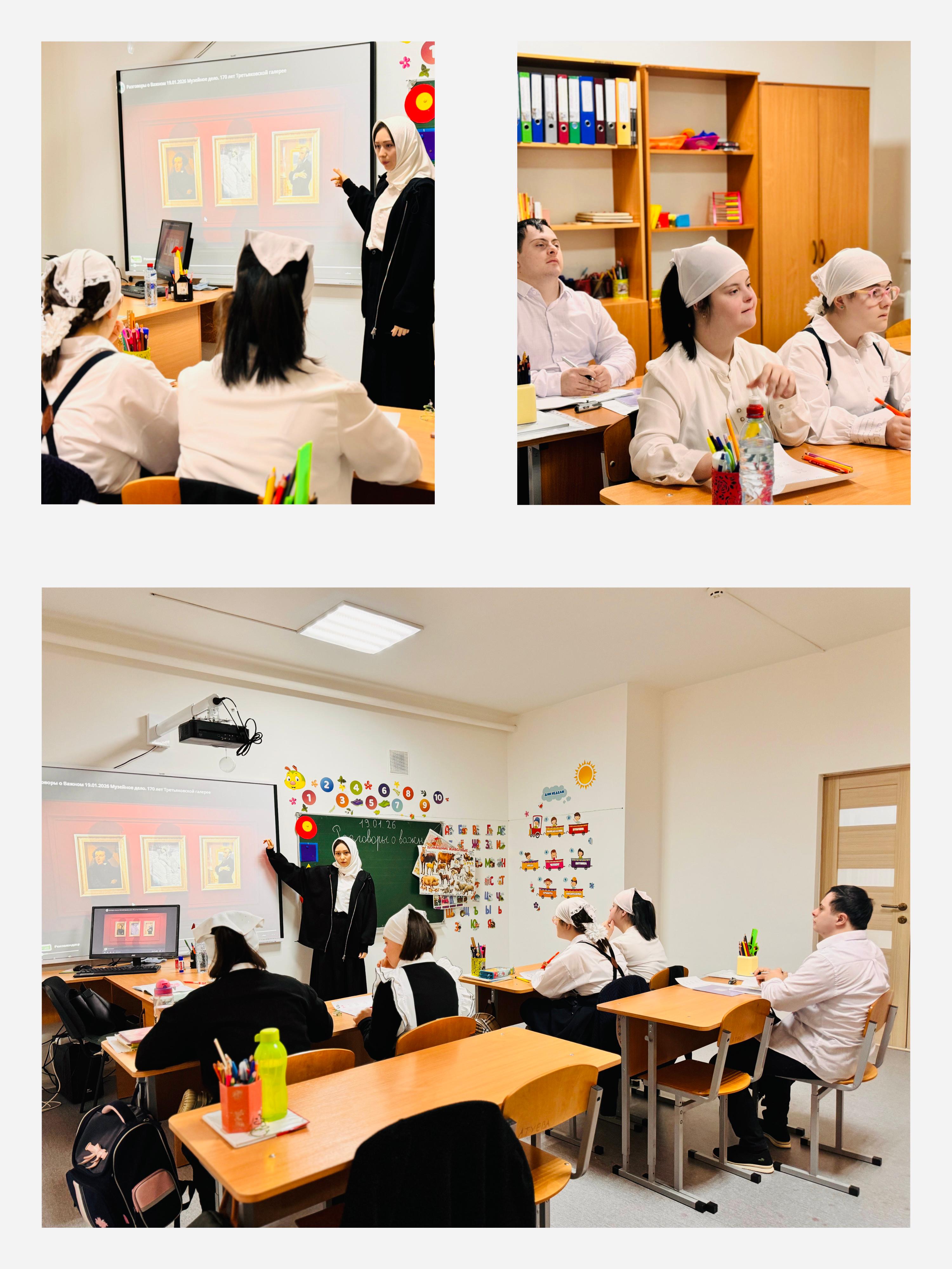19.01.2026С учащимися МБОУ "СКОШ г. Аргун" с 1-9 классов прошли внеурочные занятия «Разговоры о важном» по теме «Музейное дело. 170 лет Третьяковской галерее». Занятие приурочено к 170-летию со дня основания одного крупнейших музеев страны — Государственной Третьяковской галереи. Цель занятия — обогатить представления учащихся о служении Отечеству через сохранение культуры, углубить понимание социальной и духовной значимости творчества, а также сформировать представление о важности работы музейных работников.